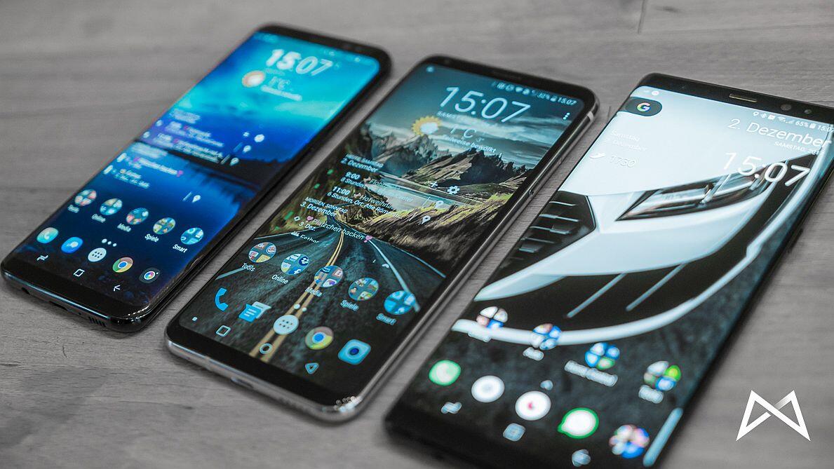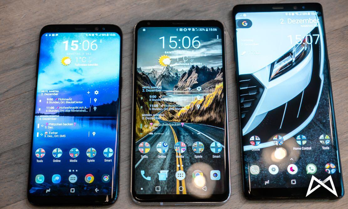 Wie eingangs schon angeschnitten, haben wir das V30 auch kurz neben das Galaxy S8 und das Galaxy Note 8 gelegt, um einen kleinen Größenvergleich zu ermöglichen. Interessant finde ich den Unterschied zwischen Samsungs 18,5:9 und dem 18:9 Format vom LG V30.