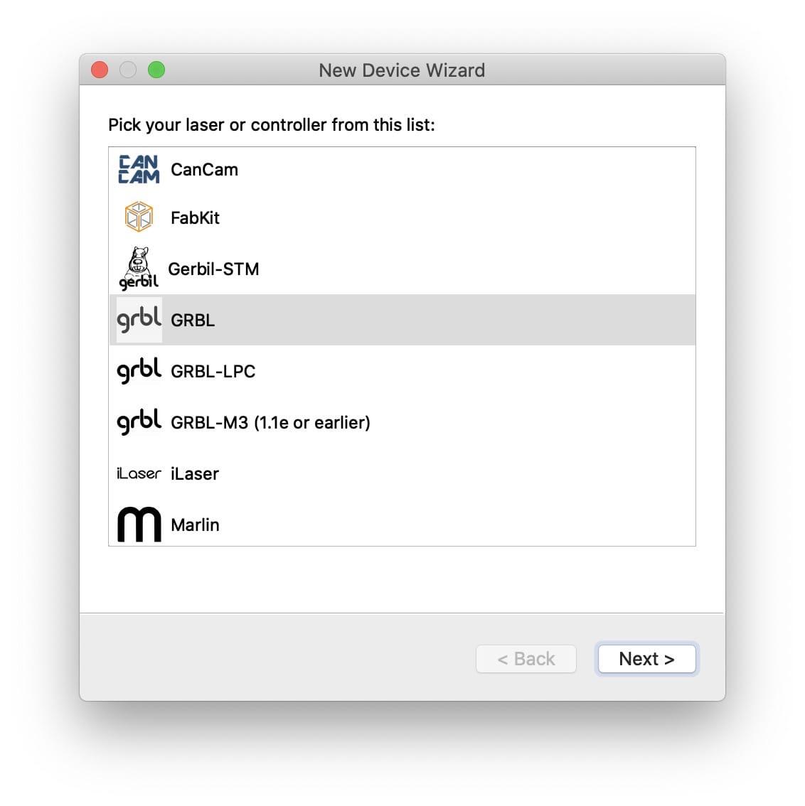 Beim ersten Start sollte der Laser angeschlossen sein und wird dann in der Anwendung gefunden und eingerichtet. So war es zumindest unter Windows.
