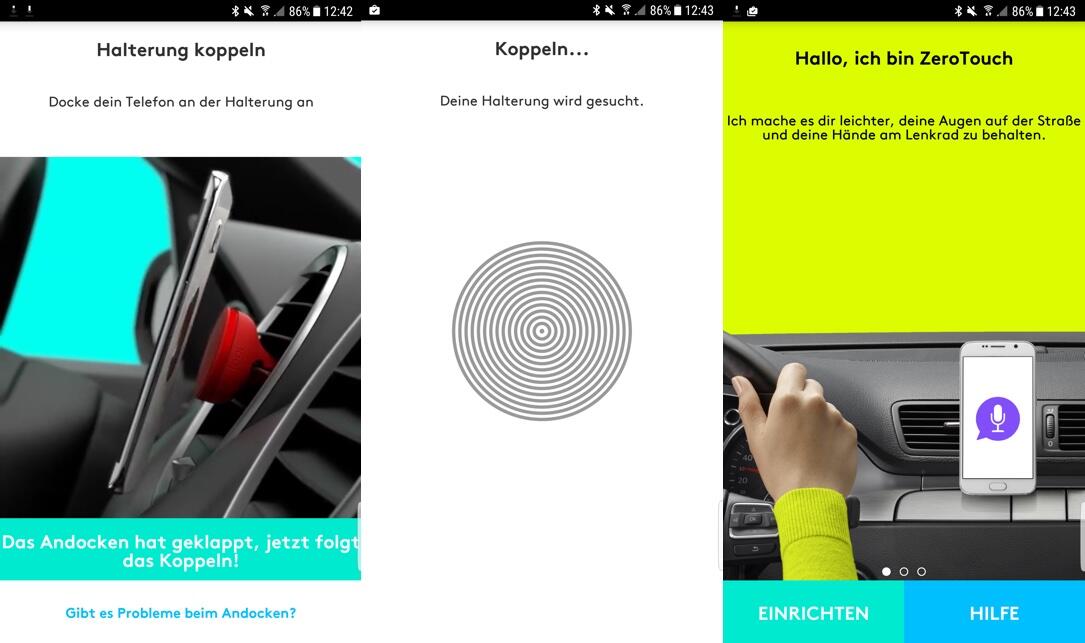 Die Einrichtung des ZeroTouch geht recht einfach von der Bühne. Der Einrichtungsassistent führt einen schnell und verständlich durch die Kopplung der Halterung an das Mobiltelefon und in die Einstellungen, um die nötigen Berechtigungen zu gewähren.