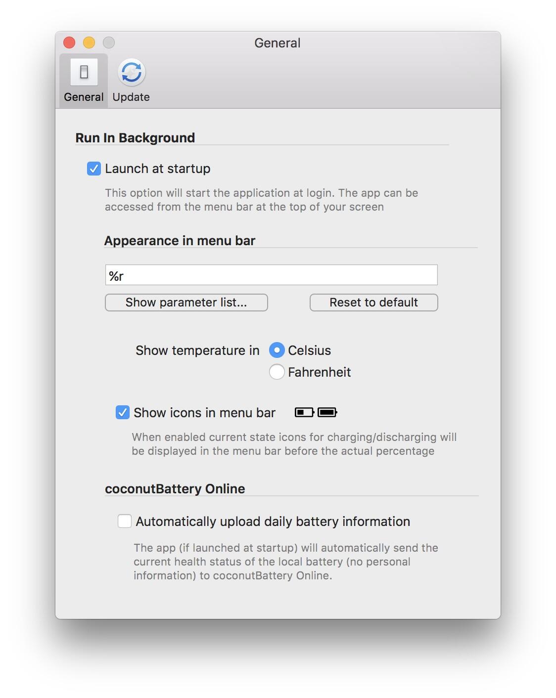Anschließend noch Show icons in menu bar aktivieren und ihr bekommt eine Prozentanzeige von Coconut Battery in die Menüleiste eingeblendet: