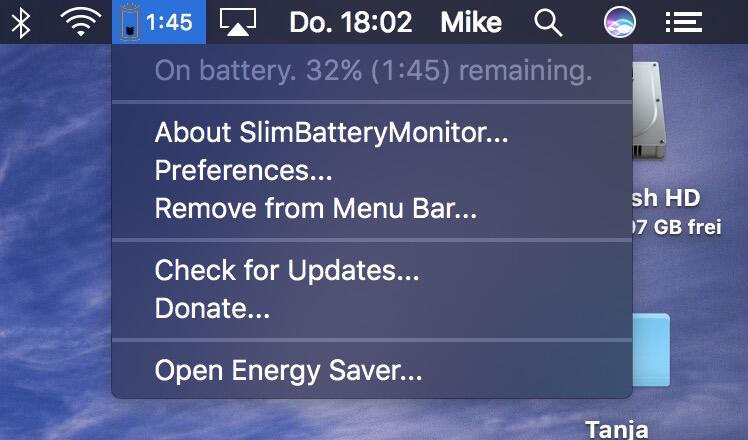 Eine weitere (hübsche) Möglichkeit die verbleibende Zeit angezeigt zu bekommen führt über die App SlimBatteryMonitor. Auch diese muss heruntergeladen und in die Programme gezogen werden. Anschließend könnt ihr noch die Farben und Formen des Icons einstellen und schon bekommt ihr die hübsche Zeit in der Menüleiste angezeigt.