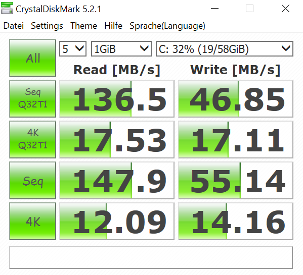 Die CrystalDiskMark-Ergebnisse entsprechen den Erwartungen.