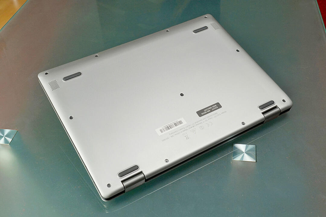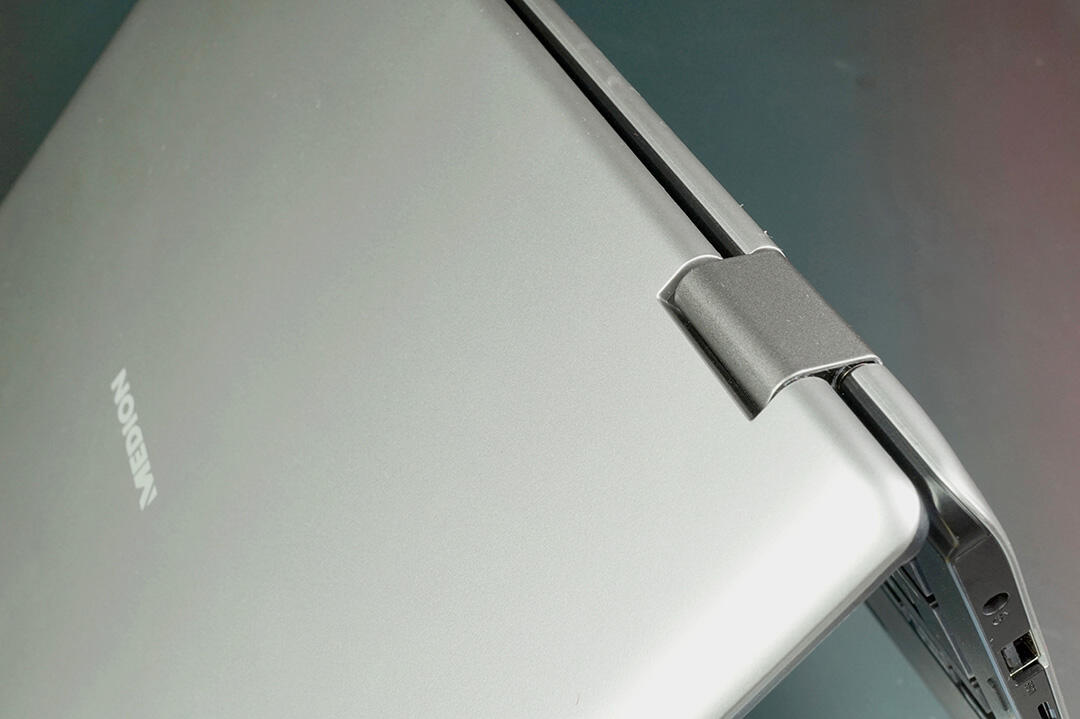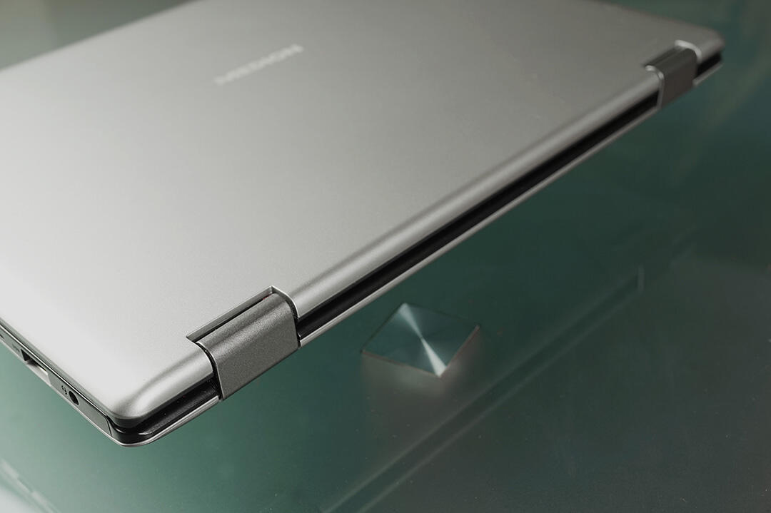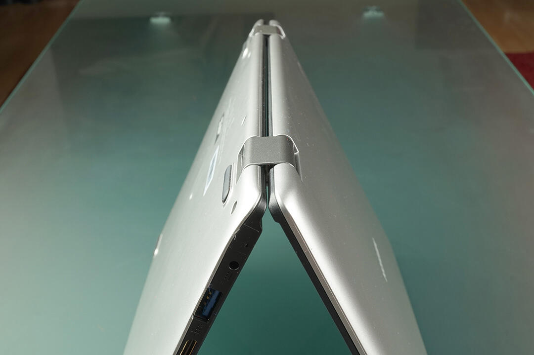 Da das Notebook als Convertible konzipiert wurde, liegt natürlich auch ein Hauptaugenmerk auf dem Scharnier. Das ist prinzipiell stabil gebaut, das Öffnen des Deckels mit einer Hand ist erwartungsgemäß nicht möglich. Im Tablet-Modus hinterlässt die Konstruktion hingegen keinen guten Eindruck.