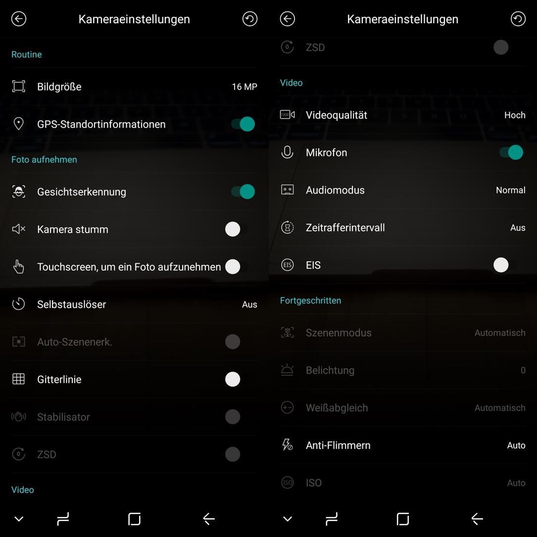 In der Kamera-Anwendung finden wir zahlreiche Einstellungsmöglichkeiten. Von der Auflösung über einen aktivierbaren elektronischen Bildstabilisator, Gesichtserkennung, Selbstauslöser etc.