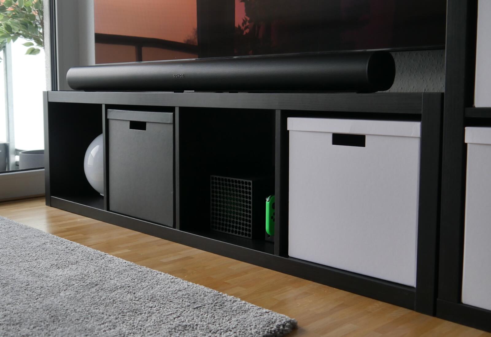 Bei der Soundbar kommt eine Sonos Arc zum Einsatz. Die ist zwar nicht gerade günstig, aber mit die beste ihrer Art. Außerdem sieht sie gut aus, ist smart und sie bietet ein sehr gutes Dolby Atmos. Sie ist über den HDMI-Arc-Anschluss mit dem Smart TV verbunden und wird über die Fernbedienung gesteuert werden.