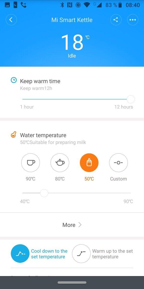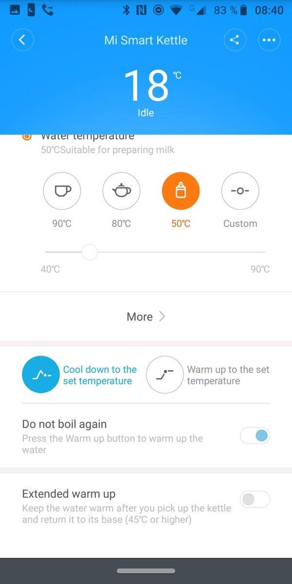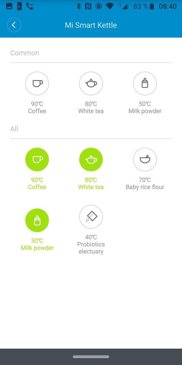 Außerdem ist eine Konfiguration per Mi-Home-App möglich, um das Wasser zum Beispiel für eine bestimmte Zeit auf einer bestimmten Temperatur zu halten. Das Smartphone verbindet sich dabei per Bluetooth mit dem Wasserkocher, sobald dieser auf der Basisstation steht.