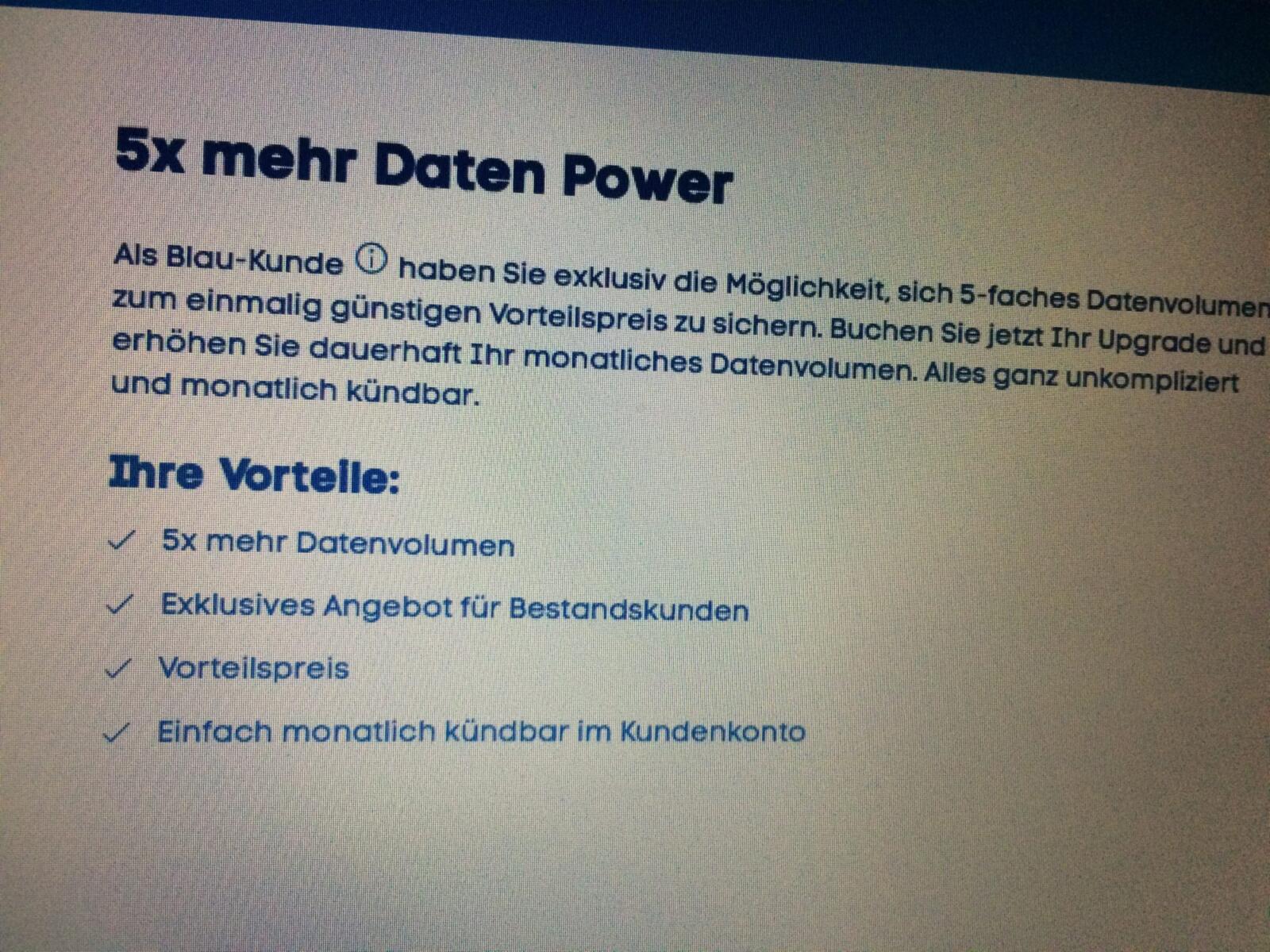 Geplagt durch ein viel zu geringes Datenvolumen für meine mobile Nutzung und auf der Suche nach einem gangbaren Ausweg, begab ich mich tatsächlich auch mal auf das Onlineportal meines Providers Blau.de und traute meinen Augen kaum: Für den absolut geringen Aufpreis von 4,99 Euro sollte ich, als monatlich kündbare Option, das fünffache (!) des in meinem Vertrag inkludierten Volumens bekommen.