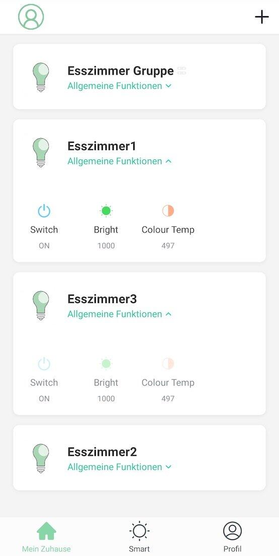In meinem Fall habe ich dieses Leuchtmittel nun wieder etwas aus der E27 Fassung geschraubt (ausgeschaltet) und die nächste WLAN-Lampe reingedreht (eingeschaltet) und den Vorgang wieder von vorn gestartet und das ganze noch einmal wiederholt, bis ich Esszimmer 1, 2 und 3 in der App sehen konnte.
