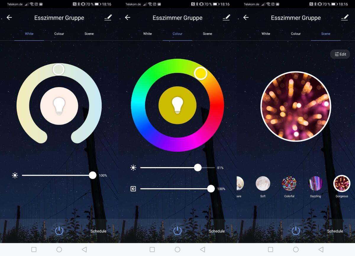 Innerhalb der Anwendung kann man dann die Helligkeit, den Weißwert, die Farbe, die Szene etc. einstellen. Auch hier entweder für jede LED-Lampe einzeln oder für eine Gruppe mit mehreren Lampen zusammen.