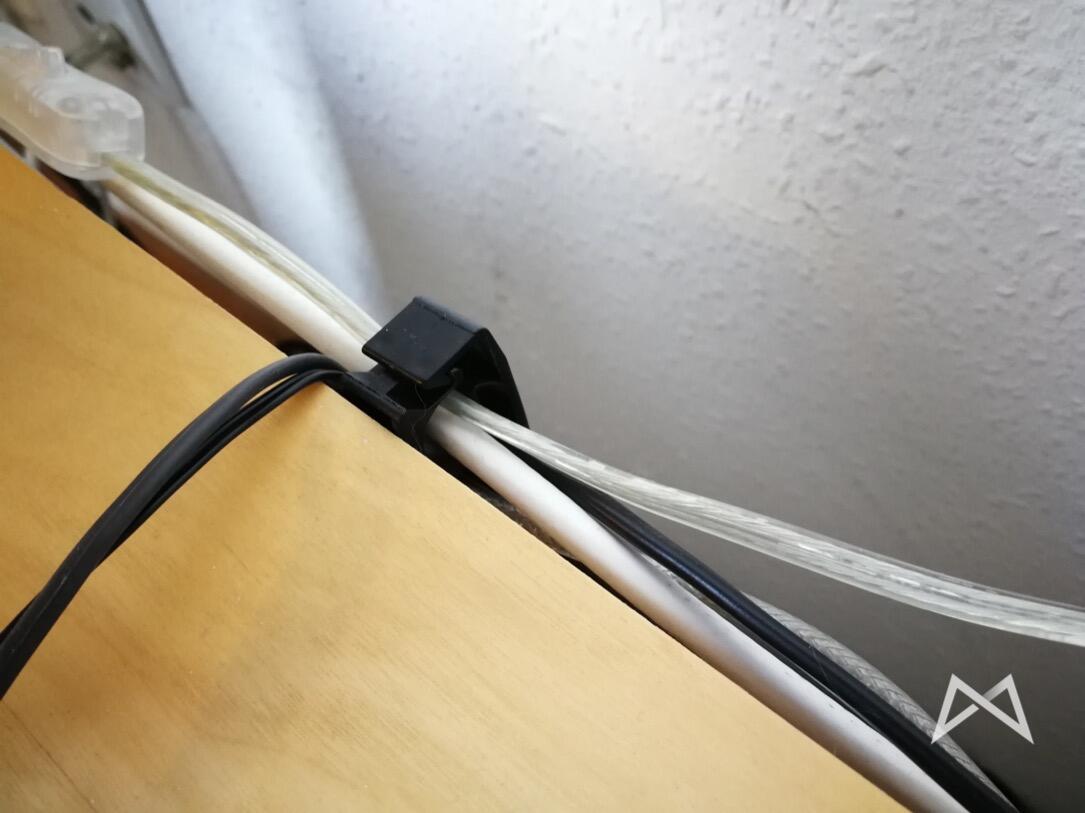 Hinter der TV-Bank habe ich direkt an den Holzrahmen Klammern befestigt, welche eigentlich zum verlegen von kleinen Rohren gedacht sind. Ich habe die damals von einem Freund bekommen und habe deshalb keinen Link zu genau diesen Teilen. Allerdings spuckte Amazon ein ähnliches Set von Hama aus, welches im Grunde bis auf die fehlende Öse für die Schraube (die von Hama sind zum kleben) das selbe Prinzip verfolgen.