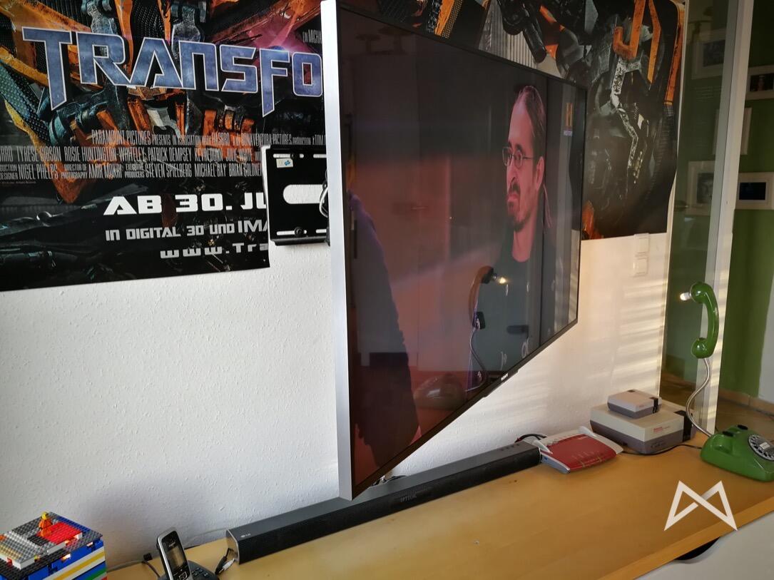 Ich fange kurz mit dem TV selbst an. Der hängt bei mir an einer vor Jahren schon günstig bei Ebay geschossenen auszieh- und schwenkbaren Halterung (ca. 20 EUR), welche es ermöglicht den Fernseher auch einige cm nach vorn zu ziehen und den TV auch noch nach rechts oder links zu schwenken, damit man im Esszimmer (rechts neben der Tür) auch noch TV schauen kann.