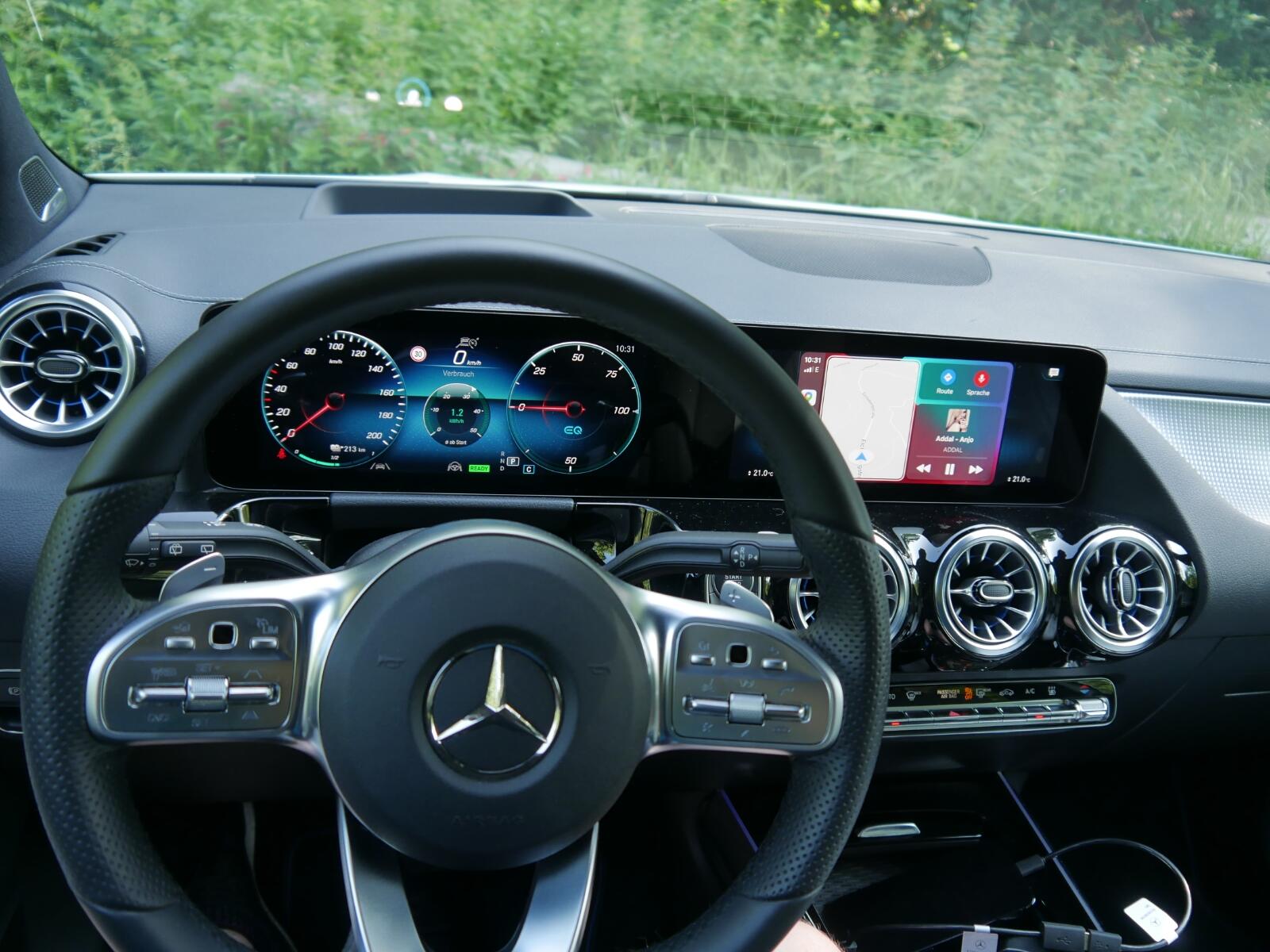 - Meine Meinung zur Bedienung ist zweigeteilt. MBUX ist optisch auch nicht mein Fall und wirkt etwas altbacken, aber ich nutze im Alltag sowieso Apple CarPlay. Was mir aber nach einer gewissen Eingewöhnung sehr gut gefallen hat, war die Bedienung über das Touchfeld in der Mitte und noch mehr über das kleine auf dem Lenkrad. Große Touchflächen haben dort nichts zu suchen, aber so ein kleines Feld, um ein bisschen in CarPlay zu navigieren und nicht immer auf das Display klicken zu müssen hat mir gut gefallen.