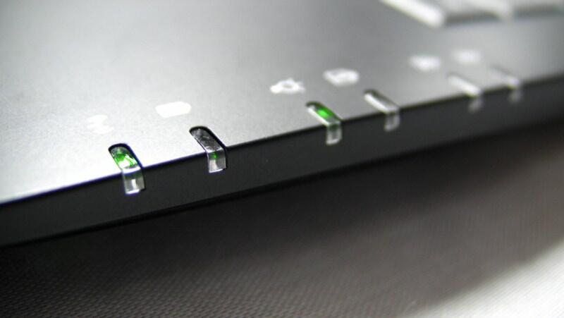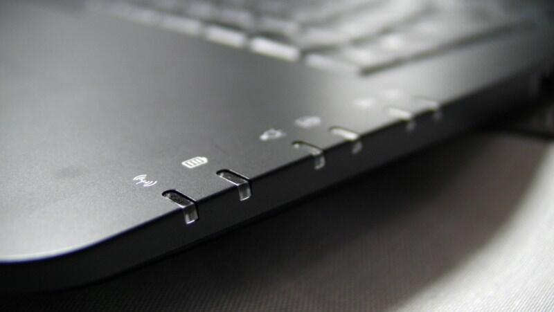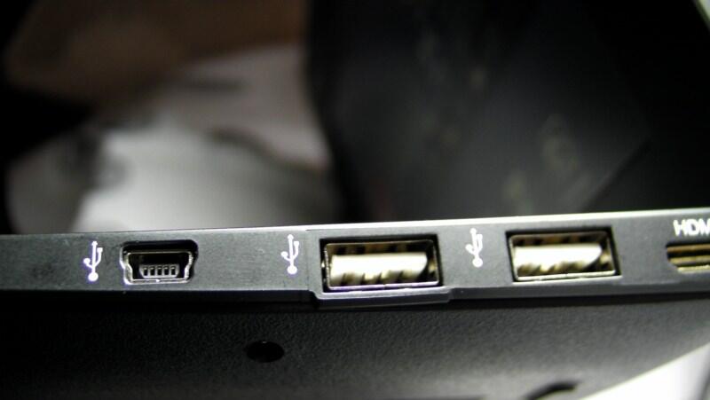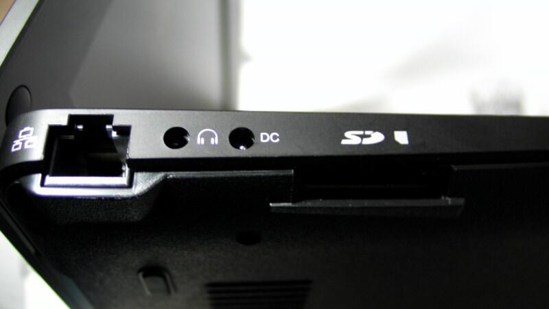 An der rechten Seite befinden sich verschiedene LEDs, welche über den aktuellen Status des Gerätes informieren. Zudem ist eine Webcam und verschiedene nützliche Anschlüsse vorhanden. So hat man neben einem SD-Karten-Slot und einem LAN RJ45-Anschluss auch zwei USB-Anschlüsse sowie einen Mini-USB-Anschluss zur Verfügung. Eine angeschlossene Maus wurde sofort erkannt. Ein Kopfhörer-Ausgang 3,5-mm-Klinke ist zudem seitlich angebracht.