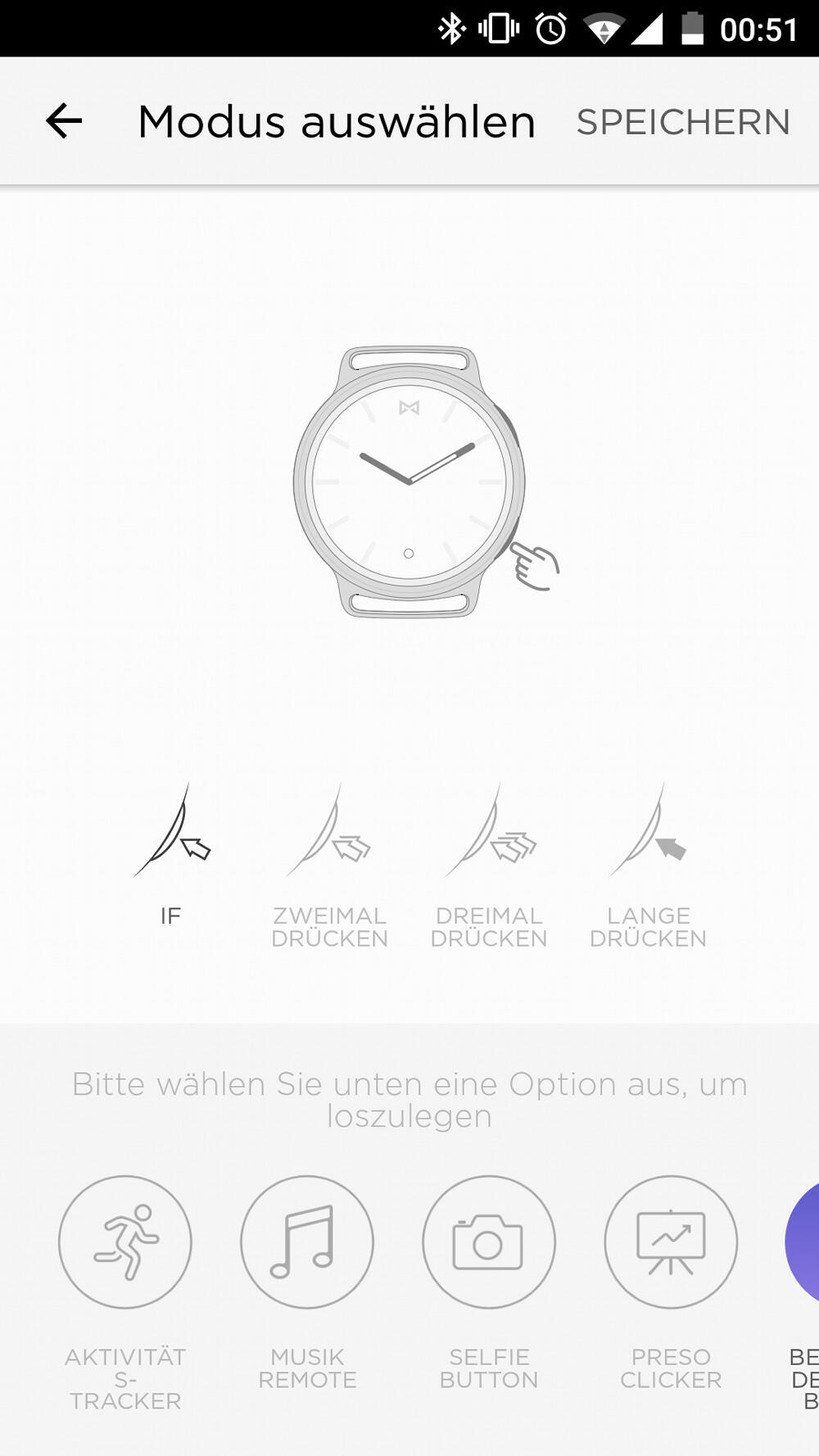 Zu guter Letzt kann die Misfit Phase auch noch dazu verwendet werden, einige Aktionen direkt vom Handgelenk aus zu steuern. Verwendet wird hierzu der untere Knopf auf der rechten Seite der Uhr, dessen Funktionalität innerhalb der Misfit-App konfiguriert werden kann. Eine Belegung ist mit bis zu vier Features möglich, wobei folgende Optionen zur Auswahl stehen: