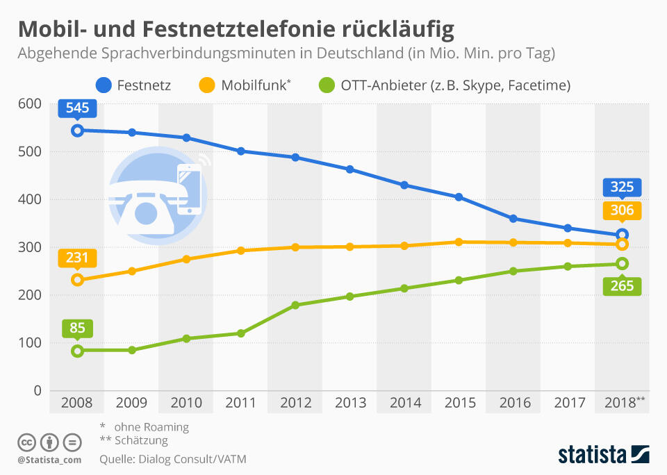 Verantwortlich hierfür sind unter anderem sogenannte Over-the-Top-Anbieter (OTT) wie Skype oder Facetime. Aktuell werden über software-basierte OTT-Telefonie täglich 265 Millionen Verbindungsminuten abgewickelt.