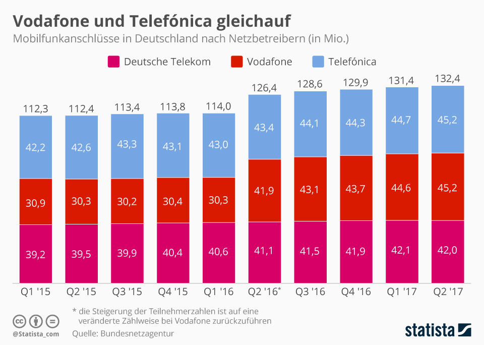 Demnach gibt es in Deutschland aktuell 132,4 Millionen aktive Mobilfunkanschlüsse. Davon entfallen jeweils rund 45,2 Millionen auf Vodafone und auf Telefónica Deutschland.