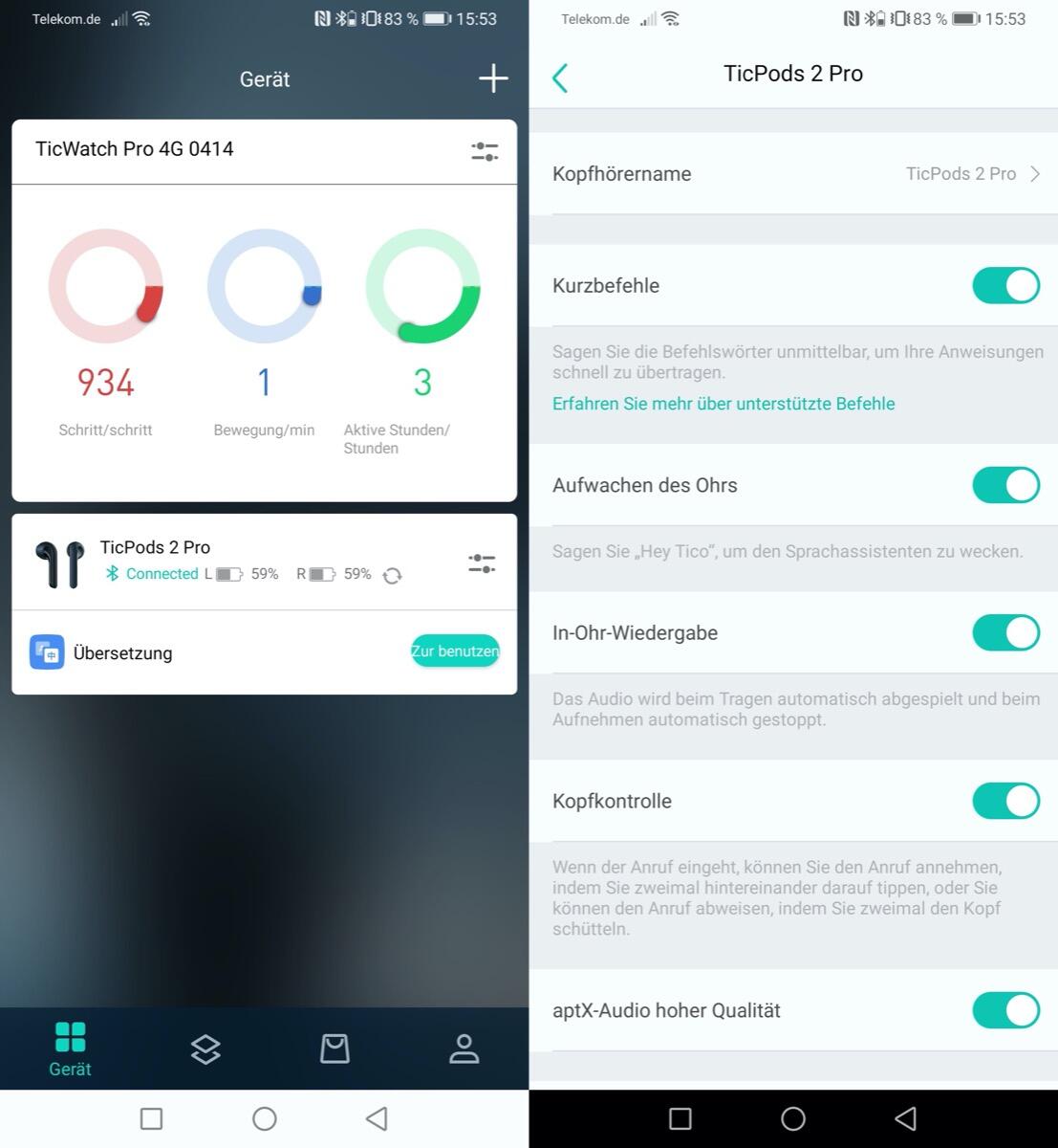 Sämtliche Konfiguration etc. wird über die Mobvoi-App vorgenommen. Hierüber werden die TicPods 2 Pro gekoppelt (das geht natürlich auch ohne die App), der Sound angepasst, aptX aktiviert, uvm. Alles einfach über das Menü.