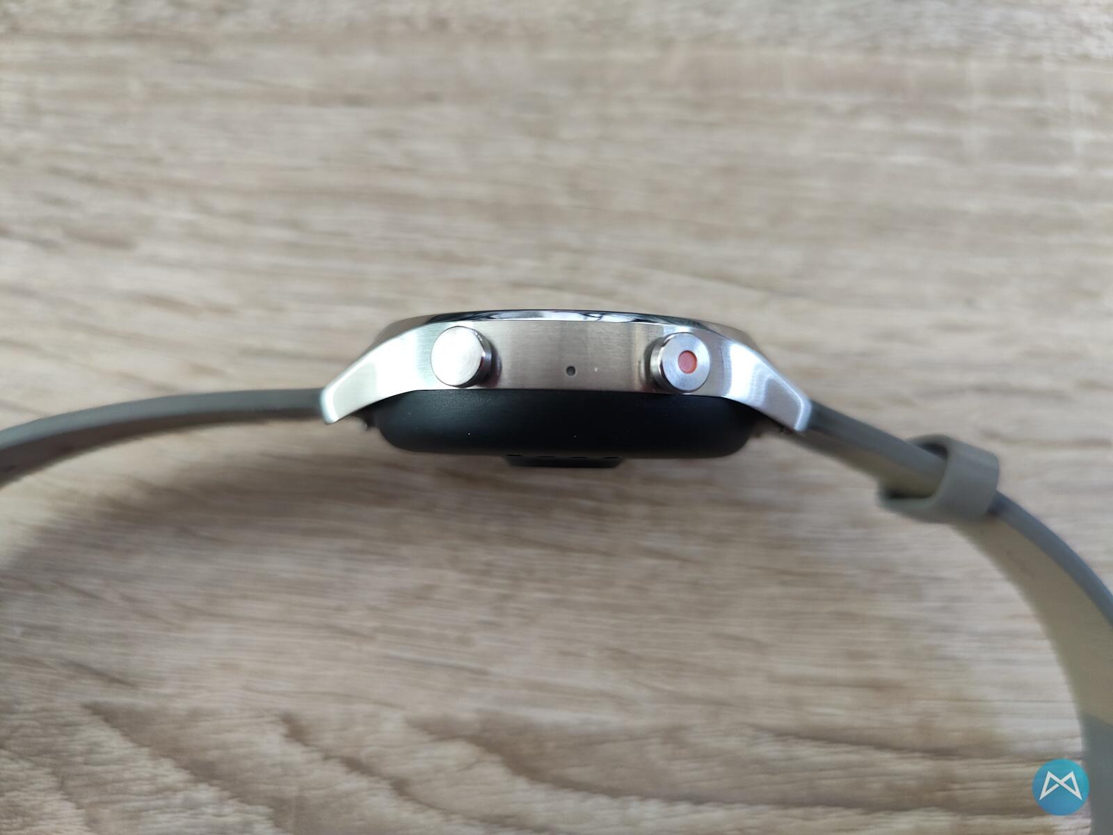 Aber zurück zur TicWatch C2+. In meiner silbernen Variante finden wir das Mikro, wie auch die beiden Knöpfe auf der rechten Seite. Der Power/Menü-Button besitzt eine spürbare Kerbe und einen rot eingefärbten Punkt in der Mitte.