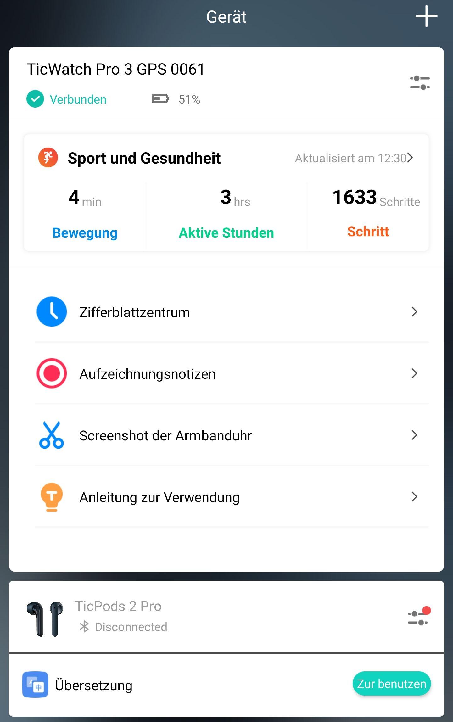 In Sachen Bluetooth musste wohl auch irgendwas geändert worden sein. Zumindest hatte ich bisher noch bei keiner TicWatch neben dem Bluetooth-Symbol in der Statusleiste auf dem Handy irgendwelche Datenübertragungspfeile. Bei Kopfhörern je nach Modell einen Akkbalken, aber sonst nichts.
