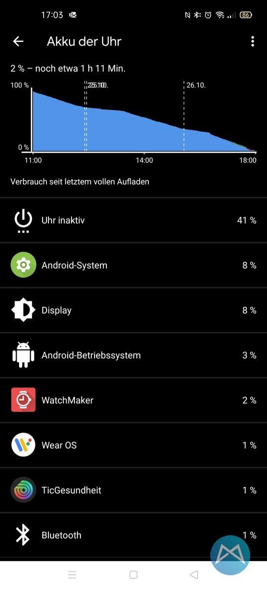 Auch der Akku ist im Falle der TWP3 stärker geworden. Obwohl die Uhr insgesamt dünner wurde, ist der Akku mit 577 mAh einer der stärksten Akkus, der von Mobvoi bisher verbaut wurde. Ich habe für den Test einige Dinge aktiviert, die ich normalerweise nicht nutze: