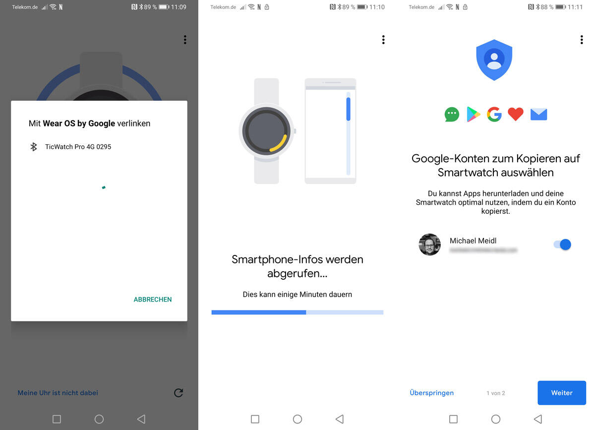 Zuerst wird wie gewohnt die Smartwatch mit dem Handy gekoppelt. Dazu die WearOS-App starten und die (zuvor am besten aufgeladene) Uhr einschalten. Es erscheint der übliche Dialog, in welchem die via Bluetooth gefundenen Uhren angezeigt werden, man kopiert sein Google Konto auf die Uhr und das war es dann 2-3 Klicks später auch schon.