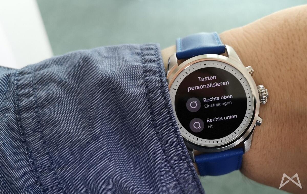 Seitlich finden wir eine dreh- und drückbare Krone zum Blättern durch die Menüs und durch die Benachrichtigungen. Darüber und darunter gibt es jeweils einen Knopf zum Drücken. Beide lassen sich in den Einstellungen der Uhr personalisieren und beispielsweise direkt mit Google Pay oder Google Fit belegen.