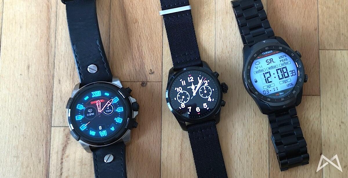 Das macht wirklich was her und ist mir so noch nicht untergekommen. Selbstverständlich habe ich die Uhr noch neben die Mobvoi TicWatch Pro (rechts) und die DieselOn Full Guard (links) gehalten und ein Foto davon geschossen. Rein vom Gehäuse her wirkt die Summit 2 in der Mitte fast schon zierlich.