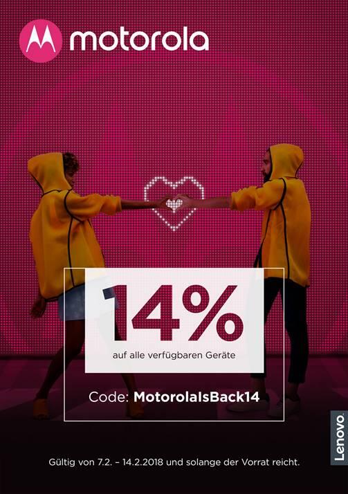 Motorola gewährt ab sofort einen Rabatt in Höhe von 14 Prozent auf sämtliche Produkte, die auf motorola.de erhältlich oder vorbestellbar sind. Um den Rabatt zu erhalten, müssen Kunden beim Auschecken im Onlineshop von Motorola Deutschland den Code MotorolaIsBack14 eingeben. Das Angebot ist ab sofort und bis zum Valentinstag, dem 14. Februar 2018 gültig.