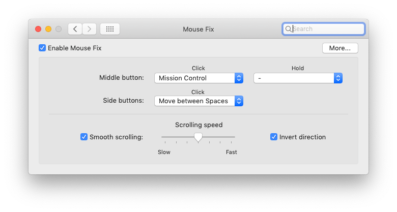 Mit Mac Mouse Fix, welches sich unauffällig in den Systemeinstellungen platziert, lassen sich einige Optionen für Mäuse festlegen. So ist zum Beispiel das schnelle Wechseln zwischen Spaces möglich oder es können Windows-ähnliches Zurück und Vorwärts-Befehle umgesetzt werden.