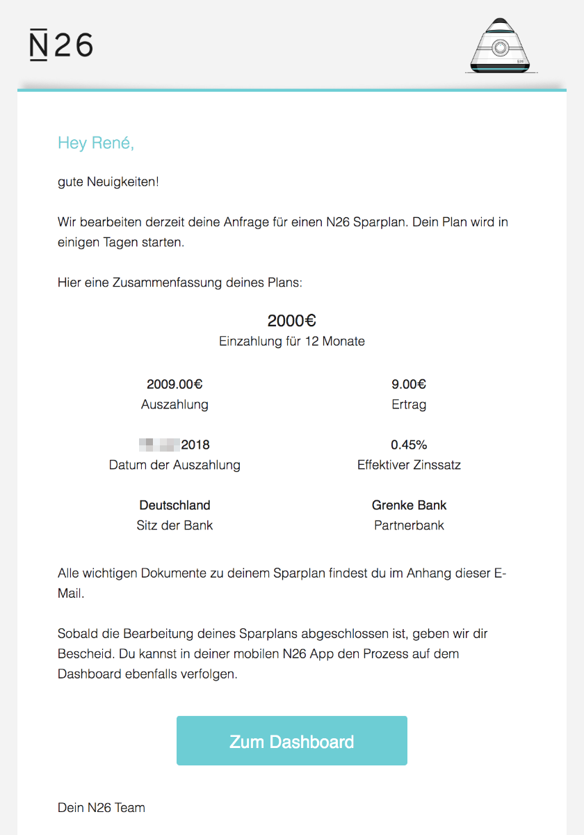 Alle Abläufe wurden bei N26 Savings automatisiert, man muss sich im Grunde also um nichts weiter kümmern. Summe, Zeitraum und Bank wählen, Geld weg, warten, Geld plus Zinsen wieder da. Genau solch einen bequemen Ablauf erwarte ich von einer „mobilen Bank“ bzw. einem modernen Fintech. Gut gemacht.