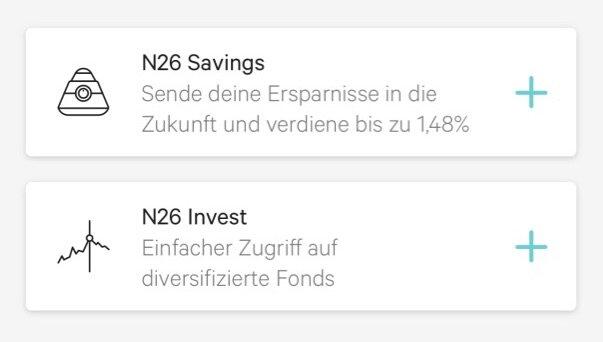 In der N26-App wählt man den Punkt „Anlegen“ aus und findet dort neben N26 Invest (diversifizierte Fonds über Vaamo) auch den Punk N26 Savings.