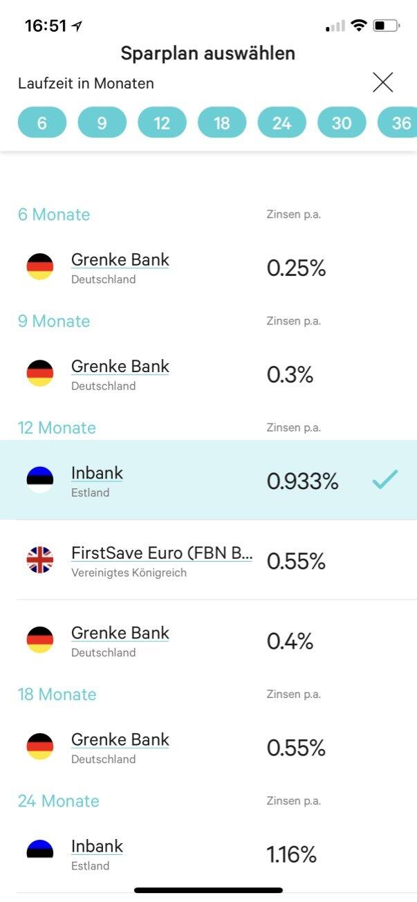 N26 setzt wie gesagt auf verschiedene Partnerbanken in Europa. Die Zinsen, die der Kunde bekommt, hängen von der Bank ab. Soll das Geld in Deutschland liegen, gibt es weniger Zinsen. Man kann während des Anlageprozesses jederzeit eine komplette Liste der Banken und Laufzeiten anzeigen lassen und dort die gewünschte Option auswählen.