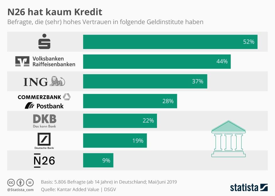 Etwa jeder zweite Befragte vertraut den Sparkassen. Dagegen sieht es für die Commerzbank und die Deutsche Bank in dieser Hinsicht eher schlecht aus, wie der Blick auf die folgende Statista-Grafik zeigt. Praktisch keinen Kredit hat ein hoch bewertetes Banking-Start-up. Nur neun Prozent haben laut der Studie Vertrauen in die Internetbank N26.