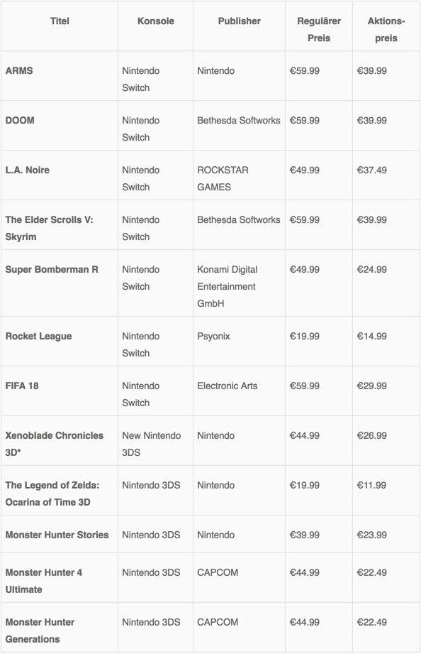 Nintendo sagt noch nicht welche Titel genau reduziert sein werden, hat uns aber schon mal eine kleine Liste mit einigen Angeboten für die Switch und 3DS gegeben: