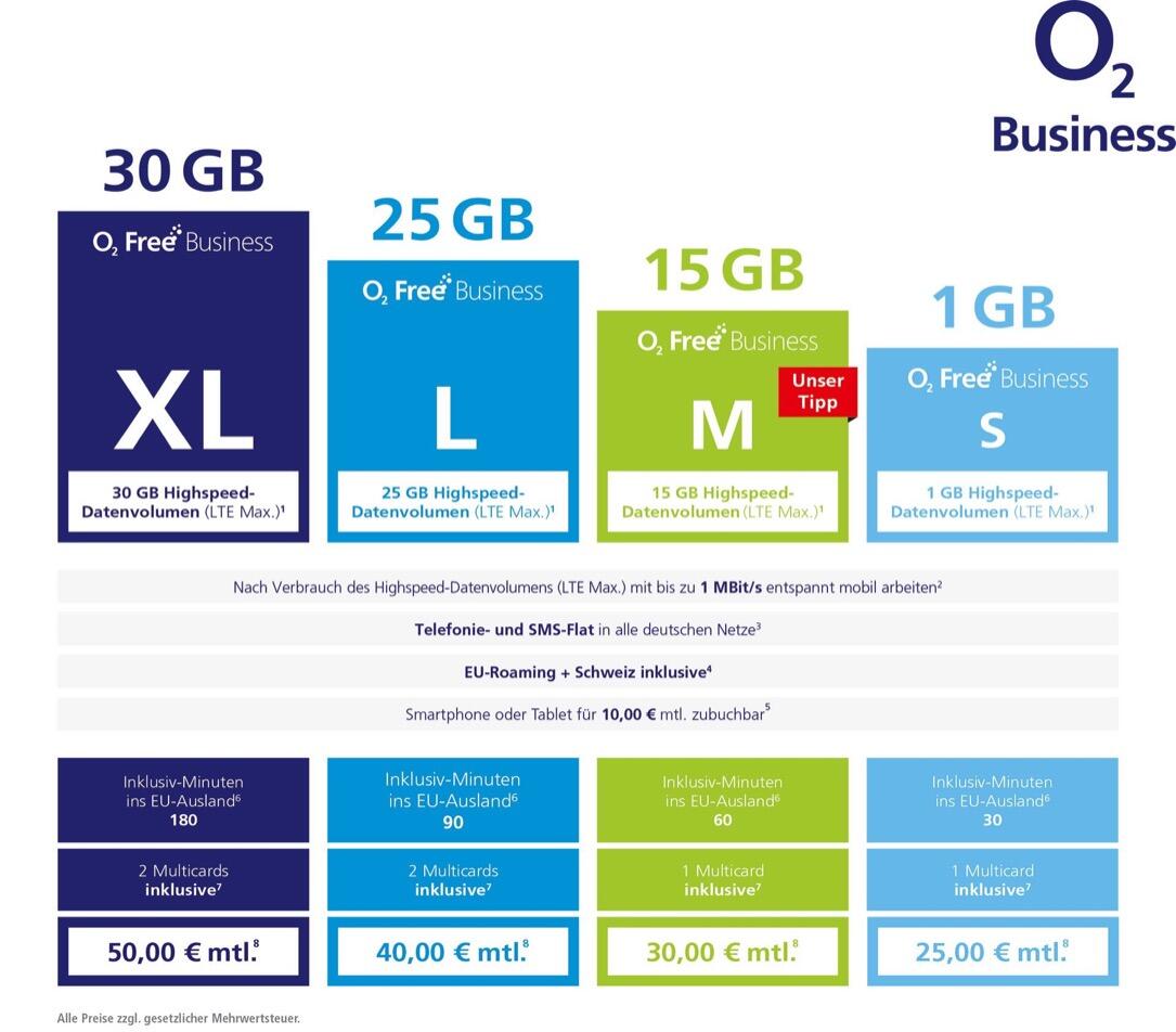 Für 25 Euro im Monat bekommen Geschäftskunden von O2 mit dem O2 Free Business S Tarif 1 GB Datenvolumen. Im O2 Free Business M Tarif gibt es für monatlich 5 Euro mehr 15 GB Datenvolumen.Im O2 Free Business L stehen Geschäftskunden für 40 Euro im Monat ab sofort 25 GB zur Verfügung. Der O2 Free Business XL wartet für 50 Euro monatlich mit 30 GB monatlichem Datenvolumen auf.