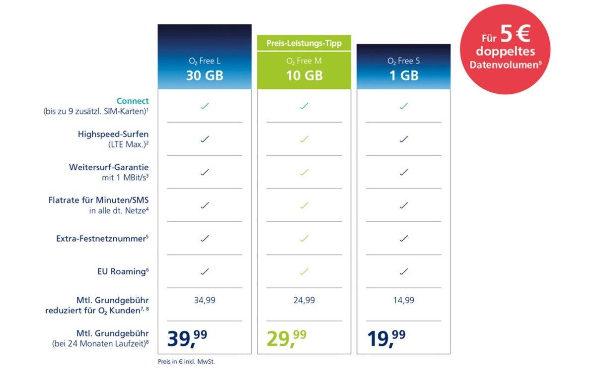 Bei O2 Free L gibt es nun allerdings 30 statt 20 GB Datenvolumen und O2 Free XL mit 25 GB Datenvolumen fällt wohl weg. Die üblichen Features wie SMS- und Telefonie-Flatrate und endlos weitersurfen mit bis zu 1000 KBit/s bleiben erhalten.