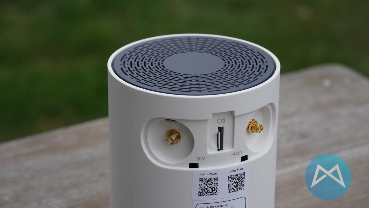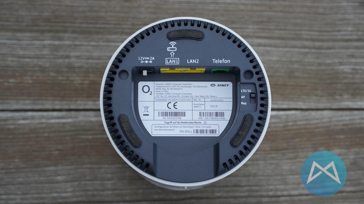 Auf der Oberseite befinden sich Lüftungsschlitze, besonders warm wurde der Router im Test aber nicht. Alle weiteren Anschlüsse befinden sich auf der Unterseite. Es gibt zwei RJ-45 Gigabit LAN Anschlüsse sowie einen RJ-11 Telefonanschluss, letzterer ist jedoch ohne Funktion, da der o2 HomeSpot Tarif ein reiner Datentarif ist!