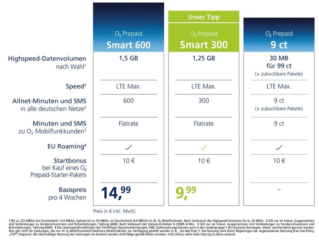 Nutzer des Grundtarifs können in die neuen Tarife O2 Prepaid Smart 300 oder O2 Smart 600 wechseln. Alle Tarife haben Roaming-Basic bereits voreingestellt, das bedeutet, Kunden können automatisch die Leistungen ihres Tarifs ohne Aufpreis auch im EU-Ausland nutzen.