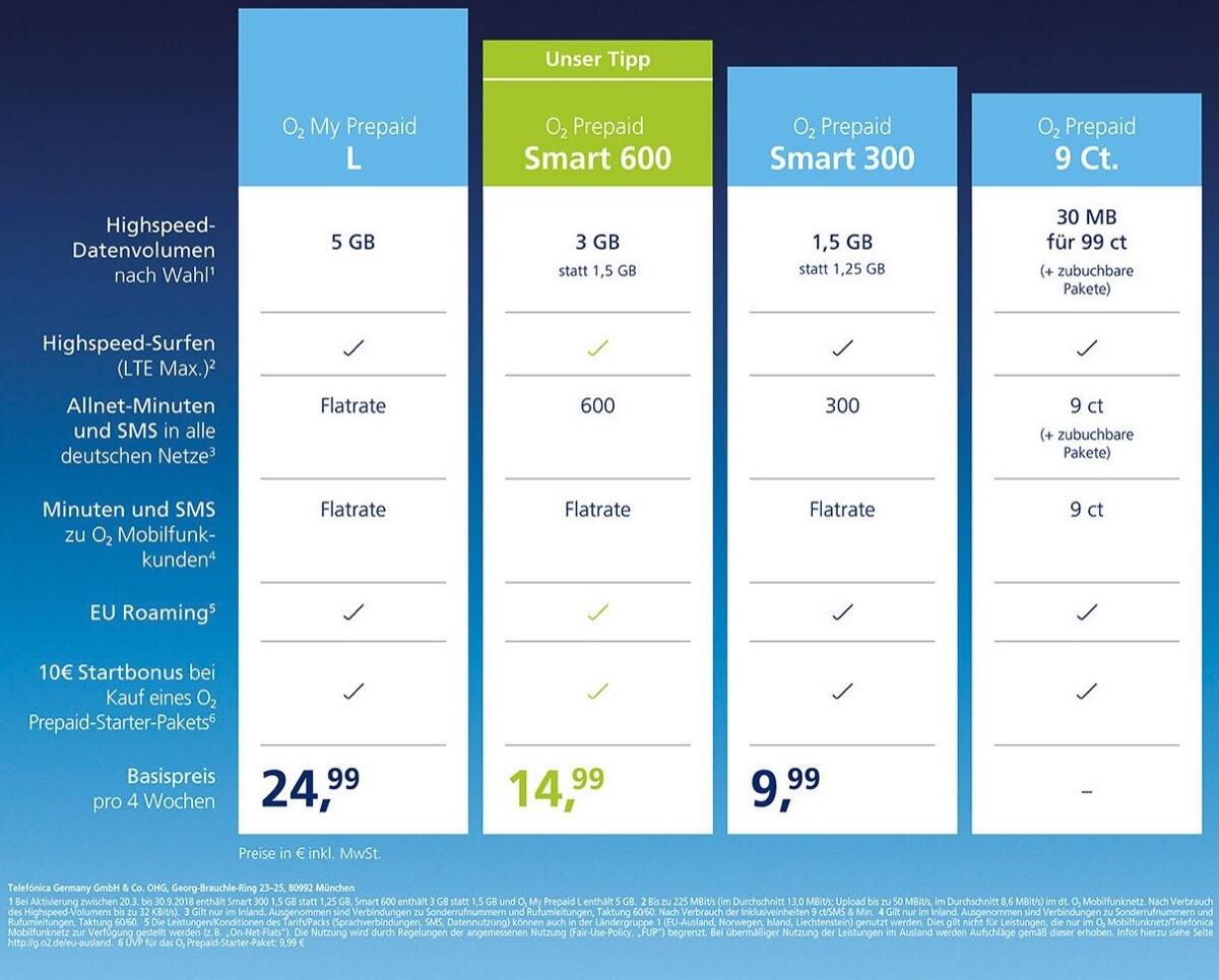 Der Einsteigertarif Smart 300 kommt jetzt mit 1,5 GB statt bisher 1,25 GB und weiterhin 300 Inklusiv-Einheiten in alle deutschen Netze für den bisherigen Preis von 9,99 Euro. In beiden Tarifen sind Anrufe und SMS innerhalb des O2 Netzes nach wie vor unbegrenzt inklusive.