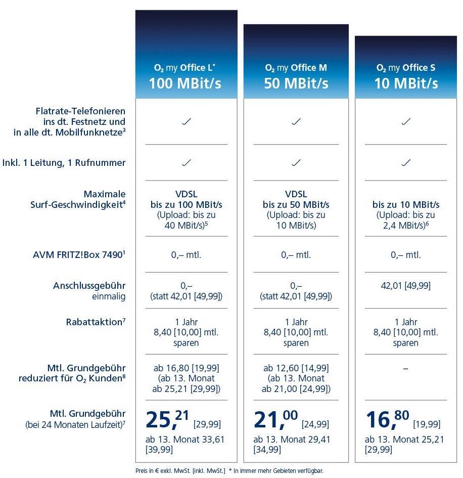 Ebenfalls ab dem 16. Oktober starten drei neue O2 my Office Tarife für Freiberufler, Selbstständige und kleinen Unternehmen. Die Details dazu könnt ihr nachfolgender Grafik entnehmen, wobei zu beachten gilt, dass die Preise exklusive Mehrwertsteuer angegeben sind.
