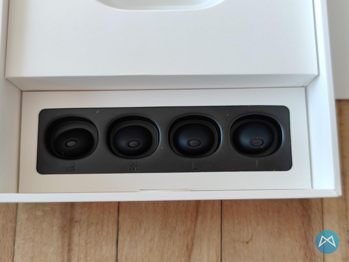 Auch hier bietet der Lieferumfang die üblichen Verdächtigen. Der Käufer bekommt also das Papierwerk, ein USB-A zu Typ-C Kabel, in der Verpackung im schwarzen Bereich noch die verschiedenen Aufsätze in M und L und natürlich das Ladecase nebst den beiden Ohrhörern selbst.