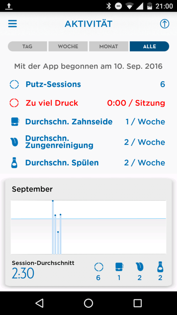 Was die sozialen Netzwerke betrifft, besteht die Möglichkeit darin Ergebnisse wie „Ich habe 3 Tage nacheinander Zahnseide benutzt“ zu teilen. Klingt irgendwie befremdlich, ich wüsste jetzt auch gar nicht, wen dass interessieren könnte, wie und wie oft ich mir die Zähne putze.