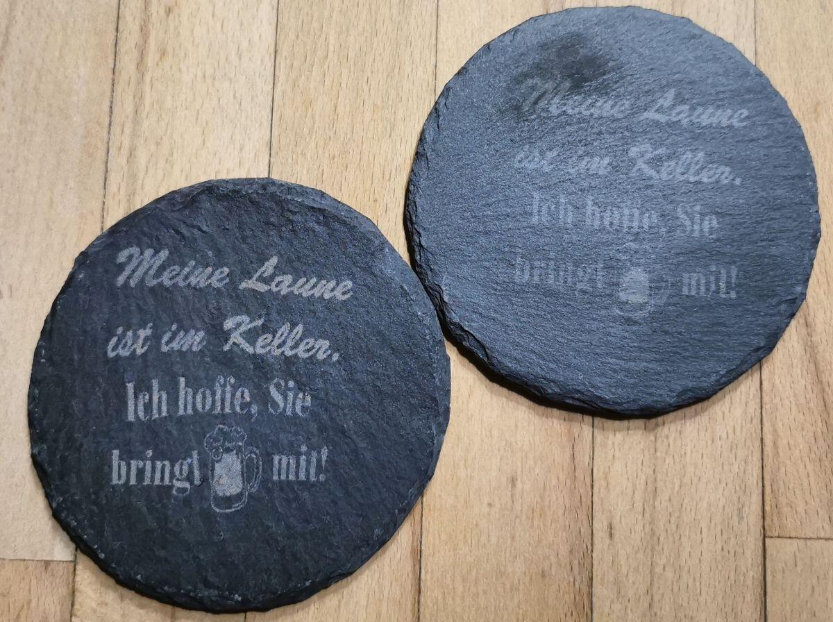 Die zweite Schieferplatte habe ich zusätzlich noch diagonal und mit 50 mm statt 100 mm gravieren lassen. Das Ergebnis zeigt sehr schön, dass dies für Schiefer eine gute Idee war.