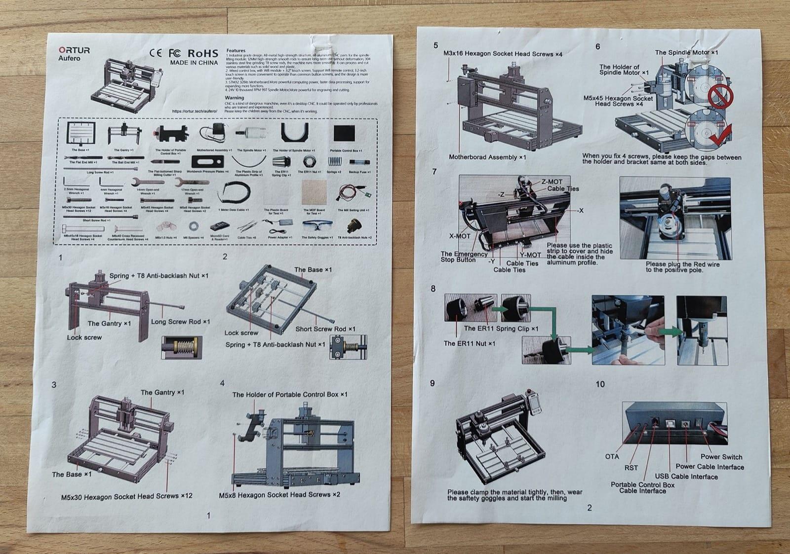 - Zusammenbau. Während ich für die Alfawise CNC noch über eine Stunde am schrauben war (nachdem Wochen später die fehlenden Teile aus China eintrafen), ist im Falle der Ortur Aufero nur ein Bruchteil der Zeit vergangen. Hier ist vieles schon vormontiert und man braucht wirklich nur wenige Schrauben reinzudrehen und die Kabel der Achsen und Endstops einzustecken. Die Anleitung besteht hier nun aus 2 Seiten, die auch völlig ausreichen!
