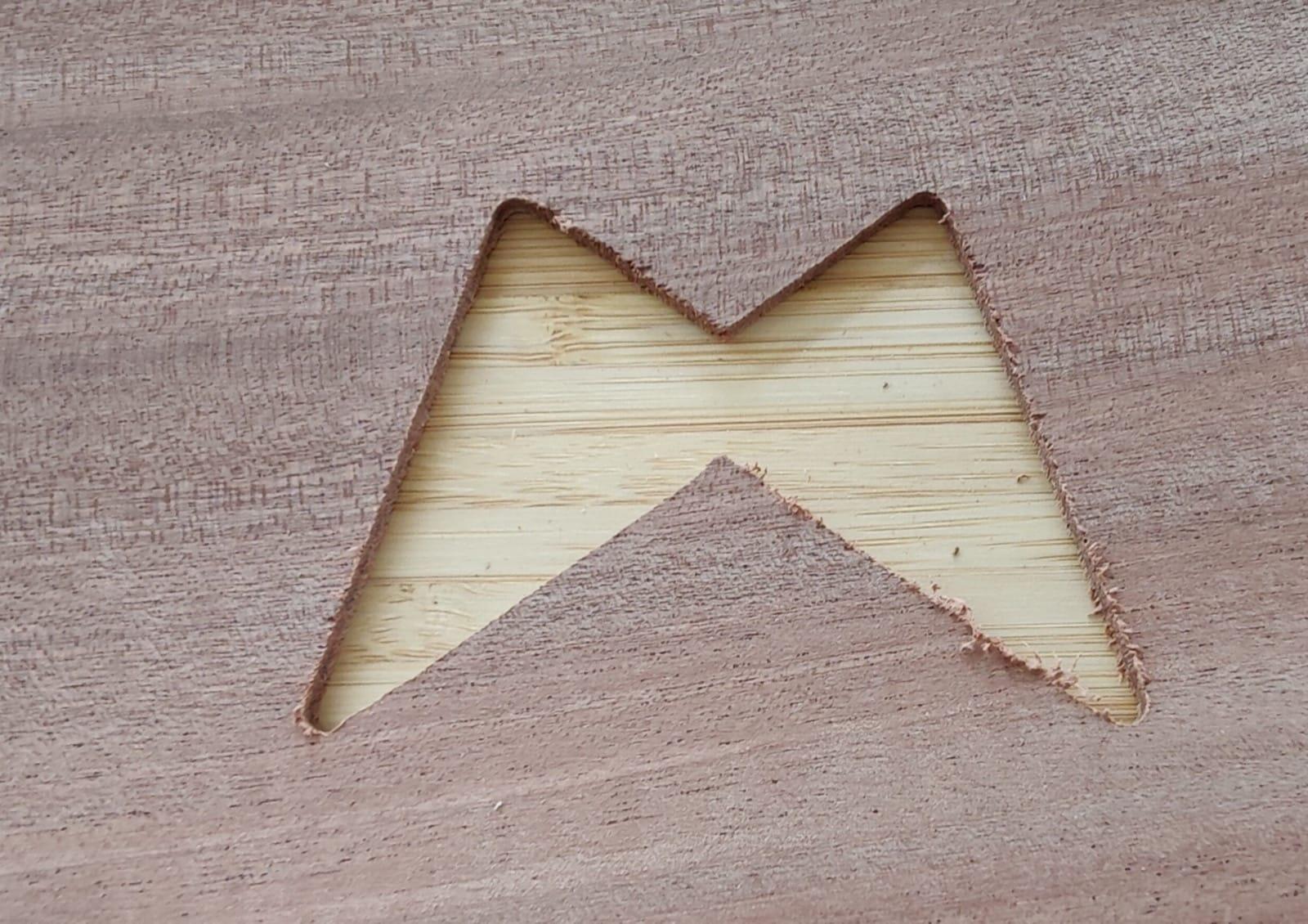 Ein bisschen auf dem Holz entlang des Schriftzugs gefeilt und schon waren die Kanten nicht mehr so stark ausgerissen. Neben dem Schriftzug seht ihr den jeweils genutzten Fräser.