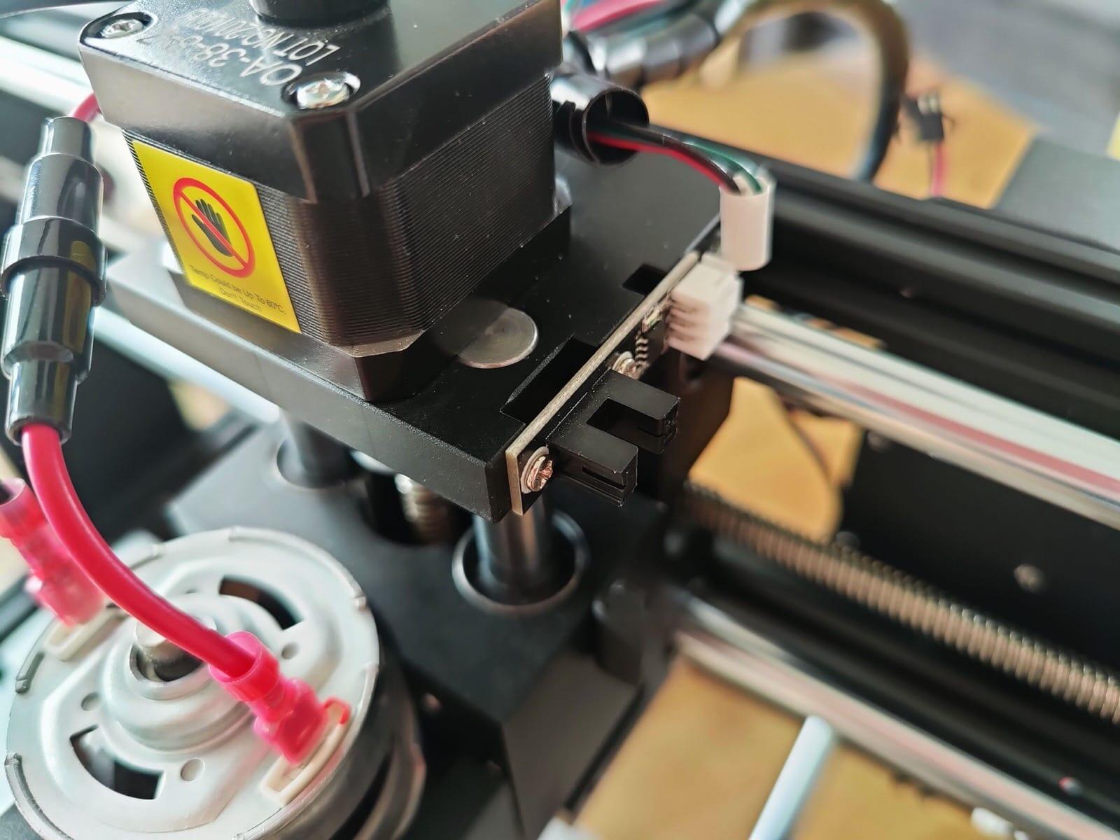 Die Aufero hat an den jeweiligen Achsen auch Endstops verbaut bekommen. Sie reagieren auf Induktion und nicht mechanisch, da mechanische Endstops durch abgefräste Teile verklemmen könnten. Die Kabel zu den Endstops und Motoren werden schön und nicht störend am Gehäuse entlang verlegt.