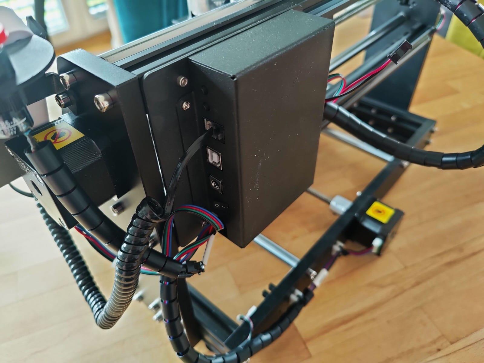 - Mainboard. Das Mainboard und sämtliche Kabel liegen bei der Alfawise Fräse einfach so offen am Gerät rum. Ein kleines Gehäuse hätte da sicher geholfen. Die Ortur Aufero hat ein Gehäuse ums Mainboard und die Kabel können sofern nötig an weißen Halterungen mit Kabelbinder am Gerät fixiert werden.