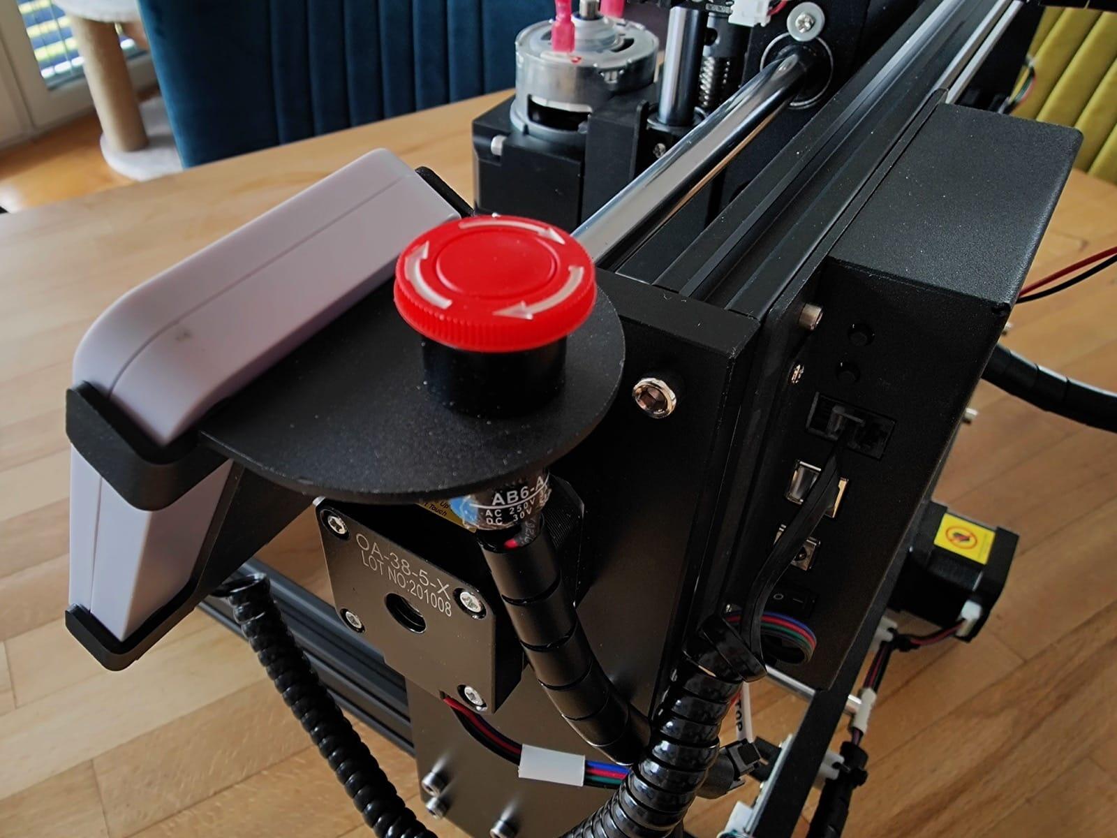 - Not-Aus. Die Ortur Aufero CNC ist auch mit einem Not-Aus Schalter ausgestattet. Mal abgesehen vom Ernstfall ist so ein Schalter, wenn mal etwas schief geht und der Fräser evtl. ins falsche Material oder zu tief einbohrt Gold wert. Bis man in der Software den Button gefunden hat und die Maschine sonst anhält kann der Bohrer schon abgebrochen sein.