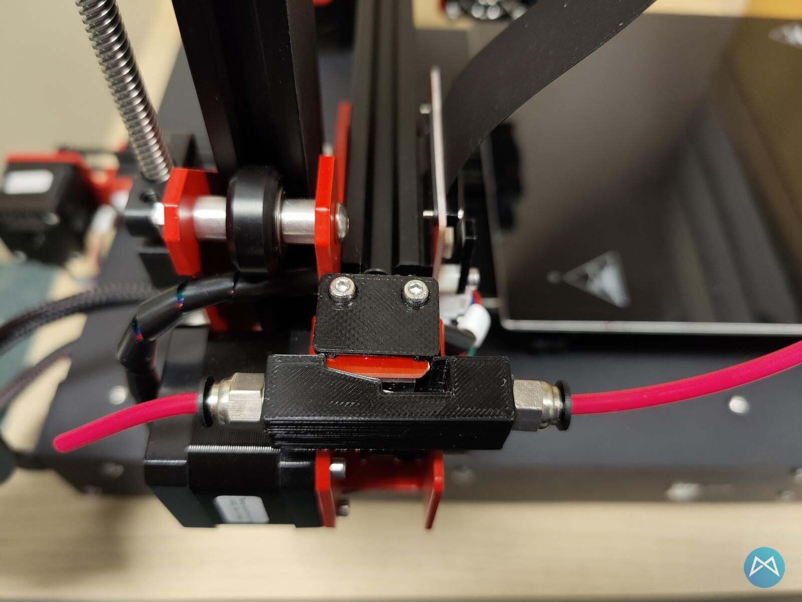 Es gibt auch einen Filament-Sensor, der leider etwas fummelig im Weg ist, wenn man das Filament wechseln möchte. Man kann zwar von oben mit einer Pinzette o. ä. reinfassen, aber dennoch gelingt es vor allem bei TPU meist nicht beim ersten mal das Filament auf dem Foto von links nach rechts durch den Schlauch zu transportieren. Eventuell hätte man das Gehäuse des Sensors doch nicht drucken sollen, um etwaige Toleranzen besser einhalten zu können?