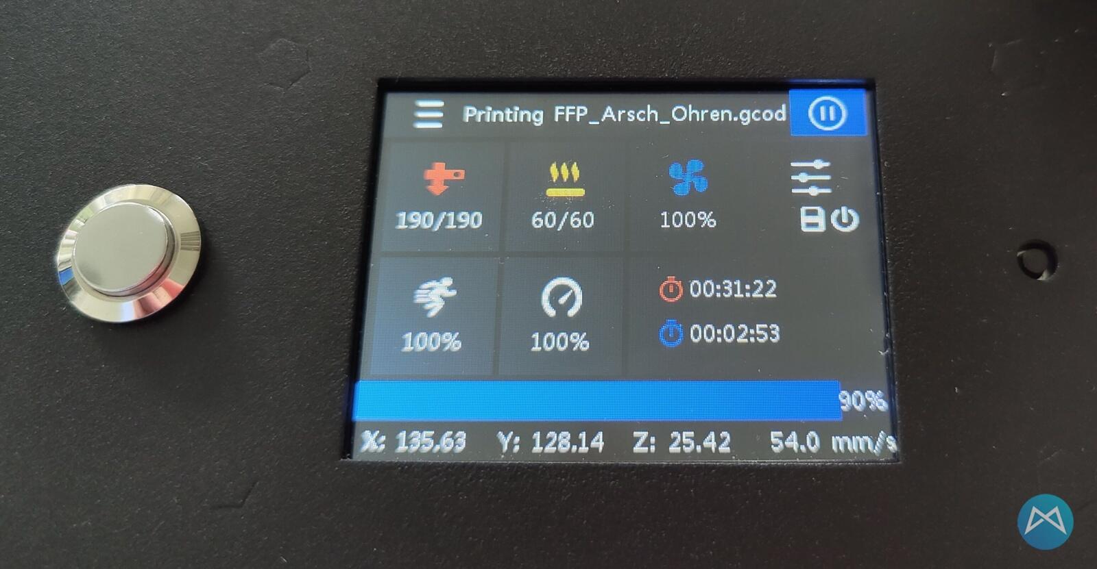 Aber das ist meckern auf hohem Niveau. Die Firmware macht das drucken sehr viel leichter. Auch während des Druckvorgangs können Temperatur, Lüfter, etc. ganz bequem via Touchscreen geregelt werden. Und alles ist eben durch die Software und das schöne Display leichter verständlich.